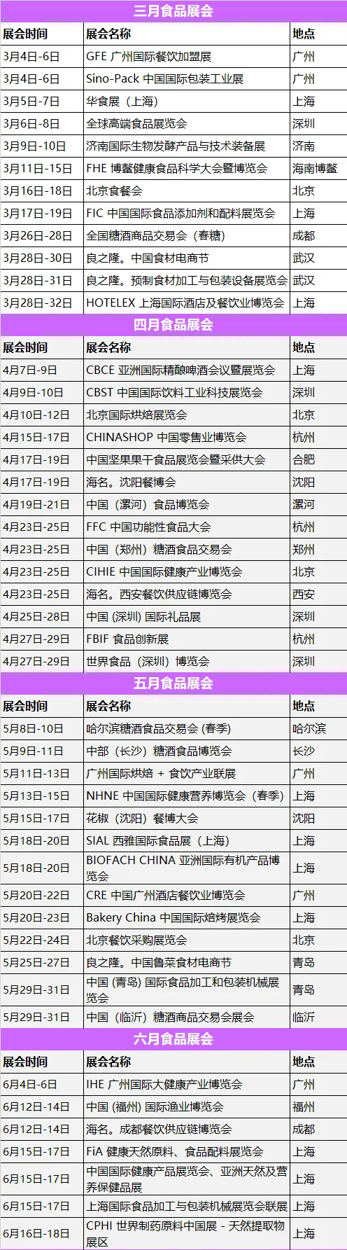 广州集中举办 GFE 餐饮加盟展、Sino-Pack 包装工业展;上海、深圳、济南等地也将开展华食展、高端食品展等活动,其中 “FHE 博鳌健康食品科学大会”(海南博鳌,3.11-15)聚焦健康食品领域。