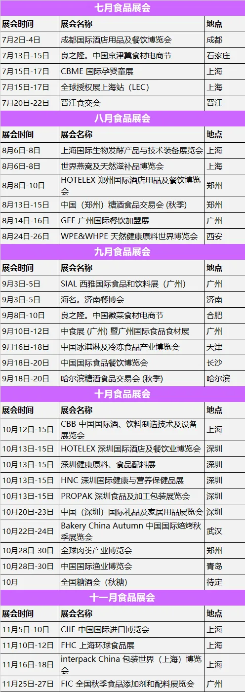 广州 SIAL 食品展、天津冰淇淋产业展、深圳多场健康原料 / 包装展集中举办;全国糖酒会(秋糖)待定,武汉烘焙秋季展、郑州肉类产业展等值得关注。