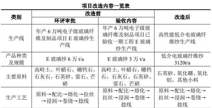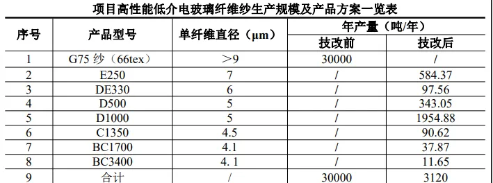 企业南厂区年产 6 万吨电子级玻璃纤维及制品项目已验收一期工程产品为 E 玻璃纱 3 万 t/a,本次改造为低介电纤维纱生产线,改造后项目生产规模及产品方案见下表。