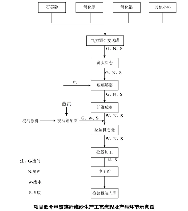项目低介电玻璃纤维纱生产工艺流程及产污环节如下图所示: