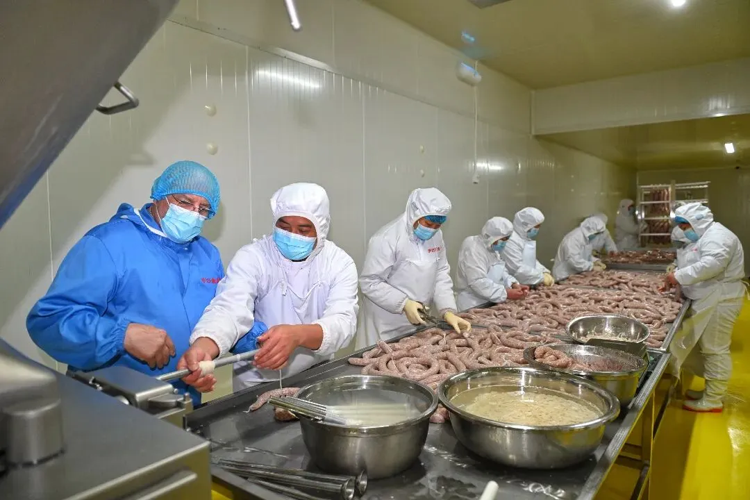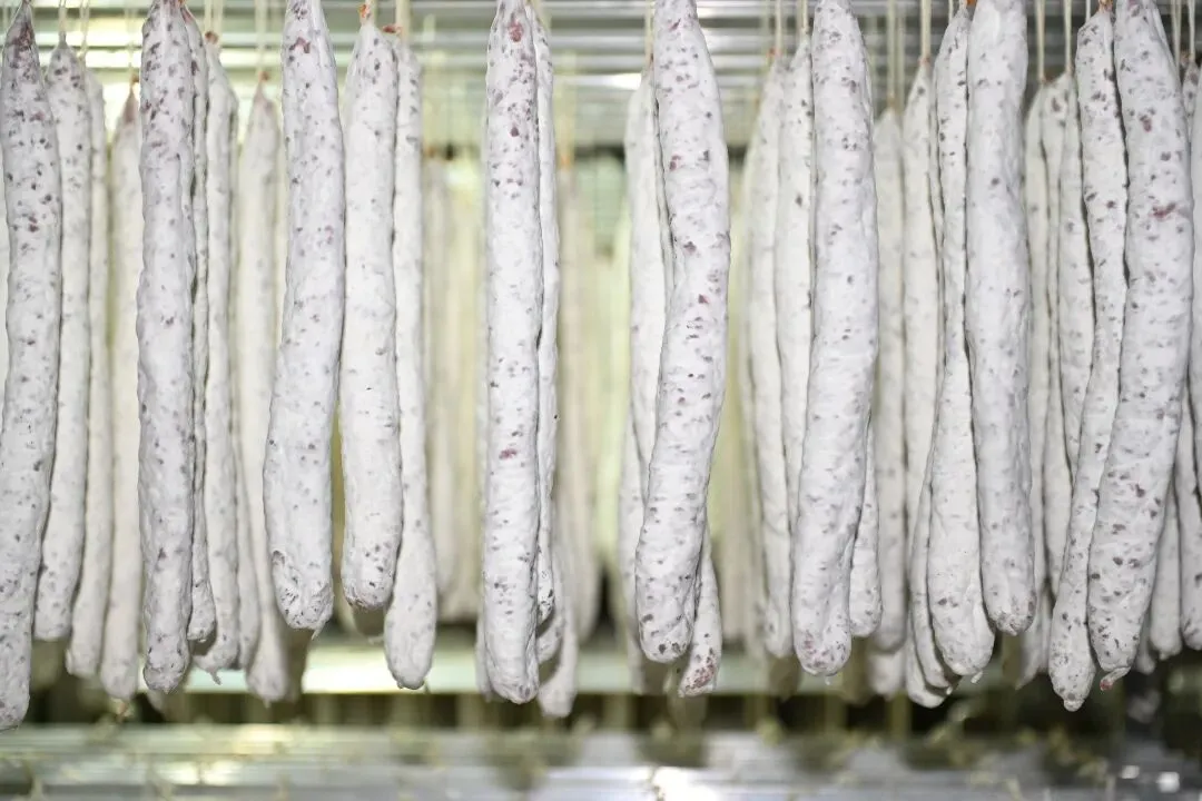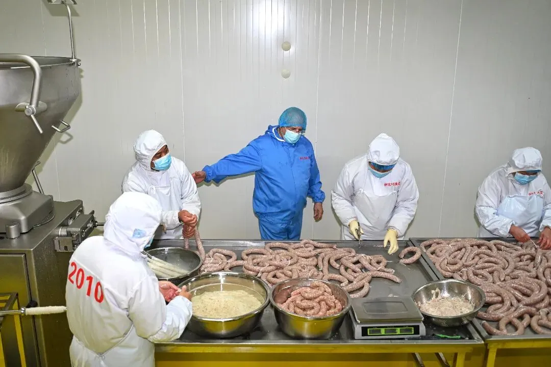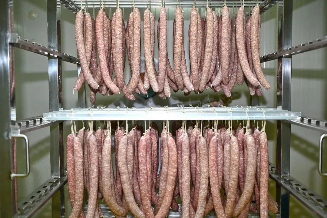 在油竹街道伊比利食品有限公司的生产车间内,来自西班牙的Magi Sala正在指导工作人员进行萨拉米生产。只见他熟练地将事先处理好的肠衣套上灌肠设备,新鲜的肉泥被推入肠中,肠衣迅速膨胀起来。在他的操作演示下,工人们很快上手,一串串香肠被整齐悬挂在架子上,等待后续发酵。