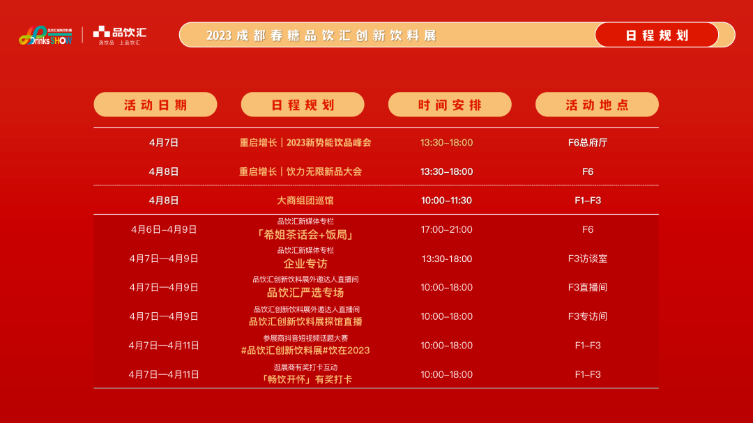 寻找新机遇,拓展新市场,共筑新增长。 本次品饮汇创新饮料展以“重启增长”为主题,将围绕“饮品行业如何建立、增强自身优势,在疫情后 更好地承接、转化市场增长势能,共同拉动饮品行业的整体增长”,品饮汇站在渠道商立场,帮渠道商选品,本次展会甄选了元气森林、华洋1982、宏宝莱、好飒、维维股份、清蓝、西域春、果汁倒了、一整根、雪都冰泉、天府可乐、蓝猴子、褚橙、橄清、养力多、初泉、花花牛等一大波优质品牌参会,同时举办“2023新势能饮品峰会、‘饮力无限’新品大会”2场行业峰会,“希姐饭局、短视频大赛、行业沙龙、企业专访”等多场活动,多维赋能,重启增长!
