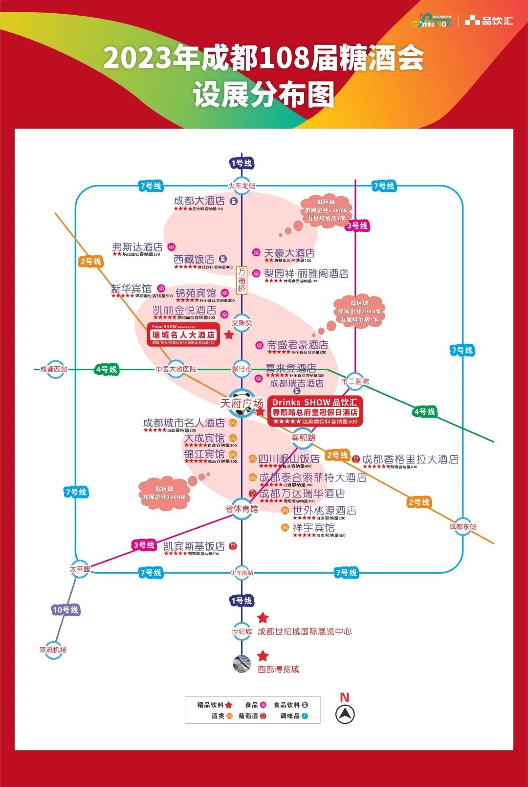 第108届全国糖酒会依旧分为会展中心及酒店展两部分,会展中心为西部博览城及成都世纪城国际展览中心;酒店展饮料板块以总府皇冠假日酒店(品饮汇创新饮料展)为经销商逛展首选之地,休食板块以瑞城名人、新华宾馆为主,酒水这以锦江宾馆为代表,综合类逛展推荐西藏饭店。
