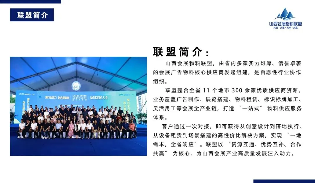【关于招募】为整合全省会展物料优质资源,高效服务客户在地市县项目落地,山西会展物料联盟现面向山西省全省招募优质供应商,共建“客户找供应商、供应商拓客源”的双向对接平台。