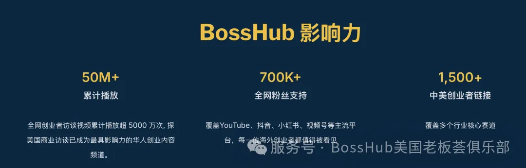 BossHub 是一个连接在美创业者、投资人、品牌与供应链的高能量商业社群平台。我们通过深度访谈、产业研究、CEO实战商学院与资源链接,聚焦本土化线下渠道、AI、跨境、电商、零售、品牌出海与美国本土创业生态,为华人创业者提供落地洞察与商业加速。