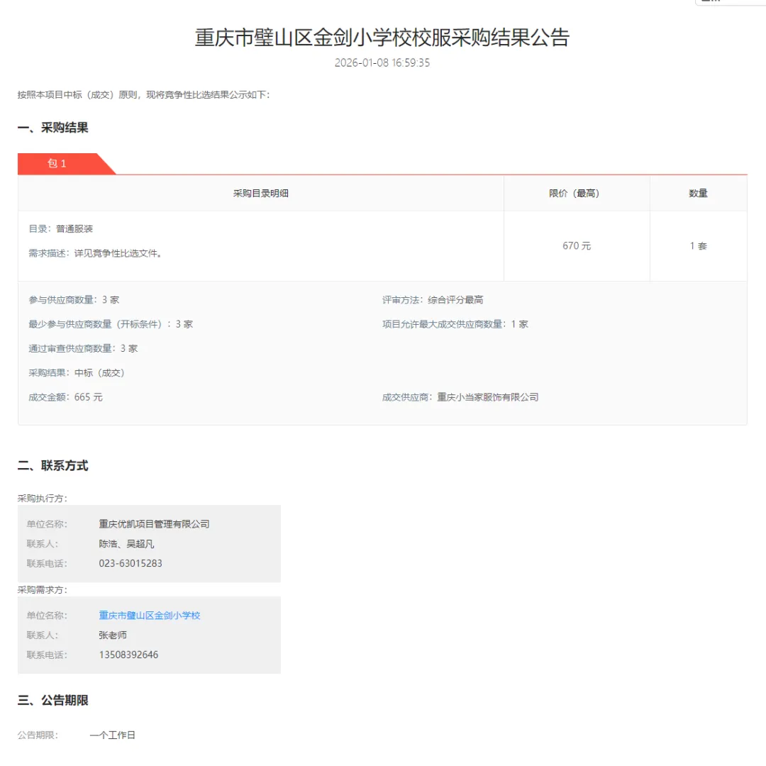 评标过程严格遵循公开、公平、公正的原则。评标专家小组依据招标文件要求,对三家投标企业的资质、产品方案、质量承诺及报价等进行了全面、细致的综合比选与评审。学校领导班子成员及家长代表全程监督,确保了评审工作的独立性与透明度。经审慎评议与集体决议,最终确定“重庆小当家服饰有限公司”为本次校服采购项目供应商。