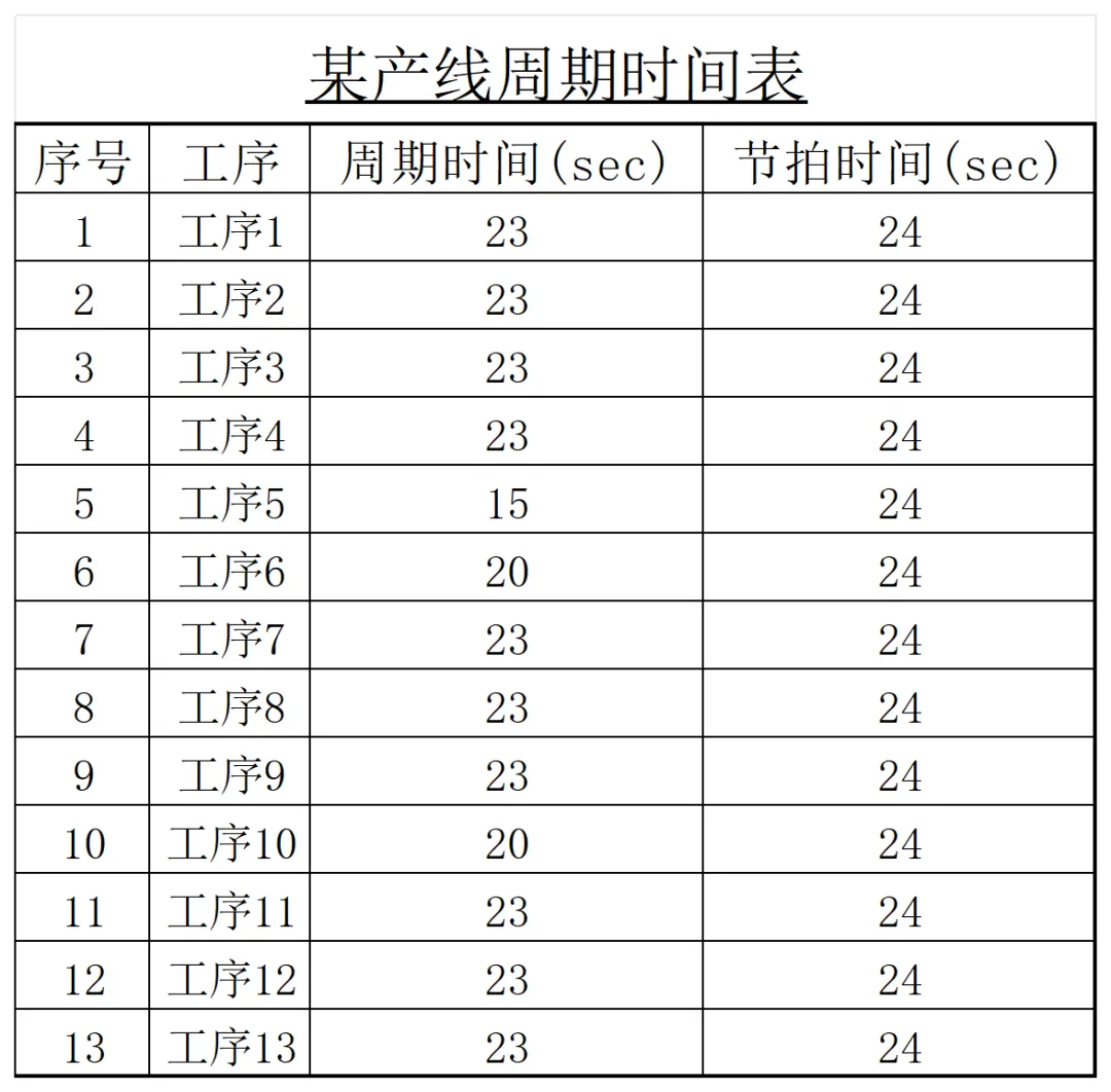 首先我们必须了解我们的产品和工艺,各个工序的周期时间,节拍时间,这里注意区分周期时间和节拍时间,周期时间是该工序生产相邻两件产品的时间间隔。