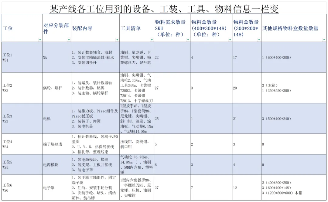 2,收集各工序需要用到的设备、工具、物料等信息,并按此设计工作台。信息收集类似下表: