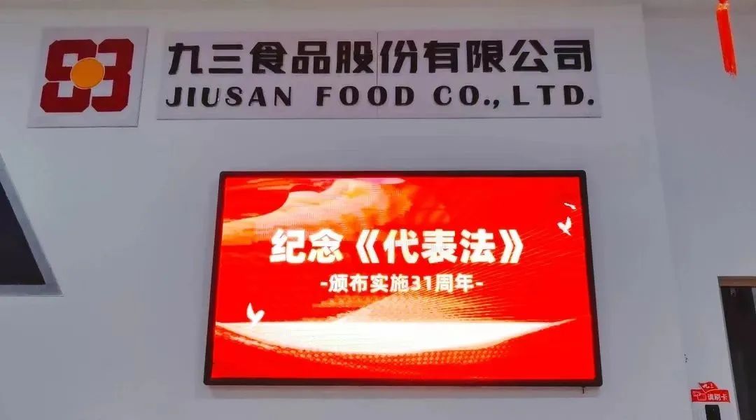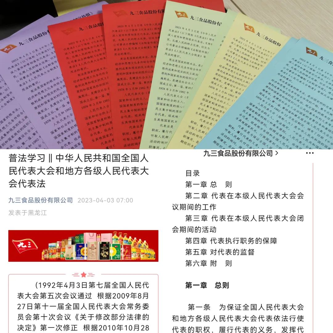 九三食品公司普法办积极谋划创新学习方式,通过LED电子屏播放宣传图片、微信平台设立普法知识专栏、印制《法制宣传报》等多种形式开展了《宪法》《代表法》《人民代表大会制度》的学习、宣传和教育活动,积极宣传人大代表的产生、会议期间人大代表的主要职责、闭会期间人大代表的主要活动等知识,加深了职工群众对《代表法》和人大代表工作的理解。倡导全体员工坚持正确的政治方向,养成学法、懂法、守法、用法的意识。