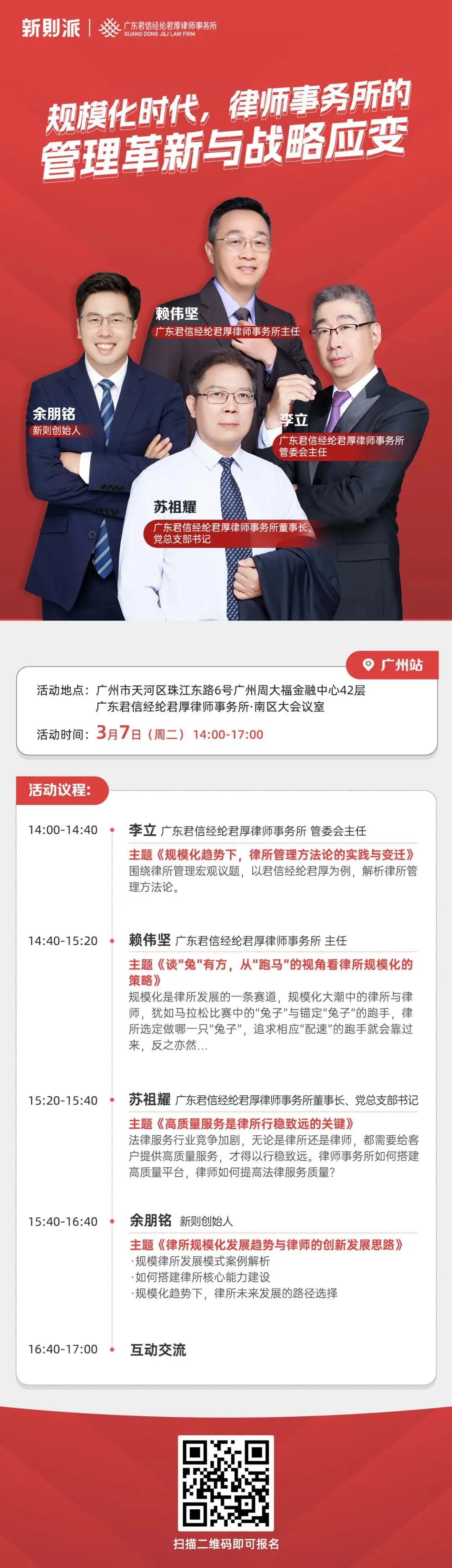 3月7日(周二),新则派联合广东君信经纶君厚律师事务所,一起探讨「规模化时代,律师事务所的管理革新与战略应变」。