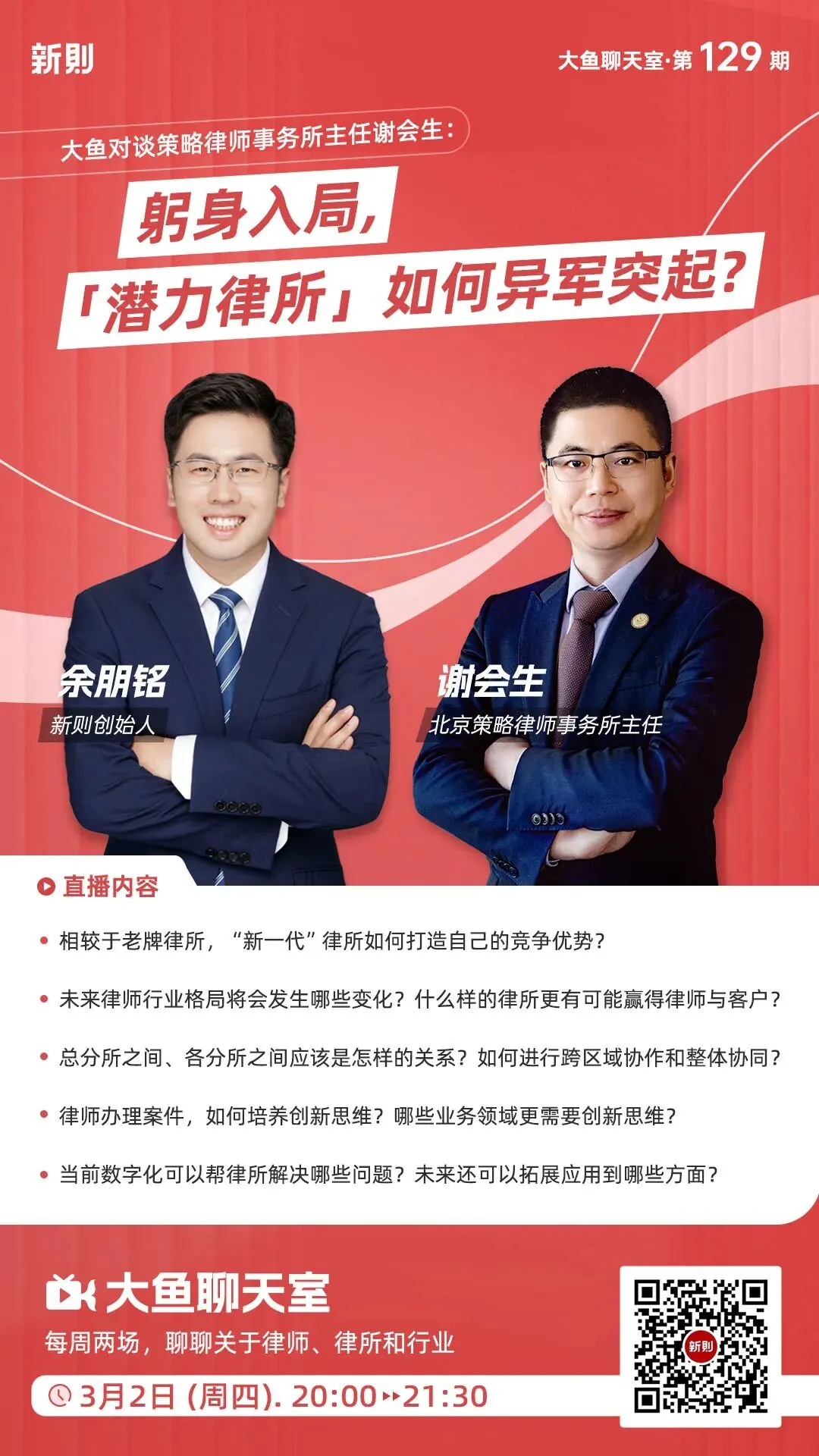 3月2日(周四),大鱼聊天室邀请到策略律师事务所谢会生主任,共同探讨「躬身入局,“潜力律所”如何异军突起?」