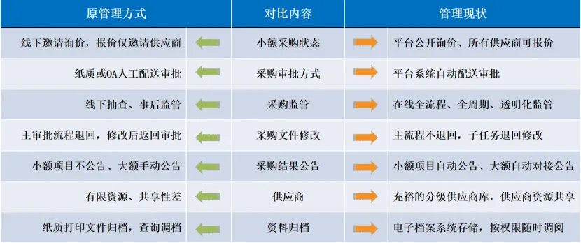 应用采购管理平台后,采购文件审批平均效率压缩3天,结果审批压缩1天。小额采购项目应公开尽公开,全面提升供应商竞争积极性。同时通过数字化赋能,极大提升采购实施规范性、风险管控水平和工作效率,实现“阳光采购”。