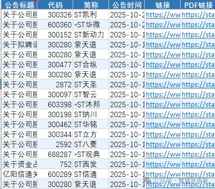 因此本团队从公开渠道收集了上市公司公告标题中含有退市的文本供大家研究使用,文本总数超1w+条,时间跨度为198-2025年。