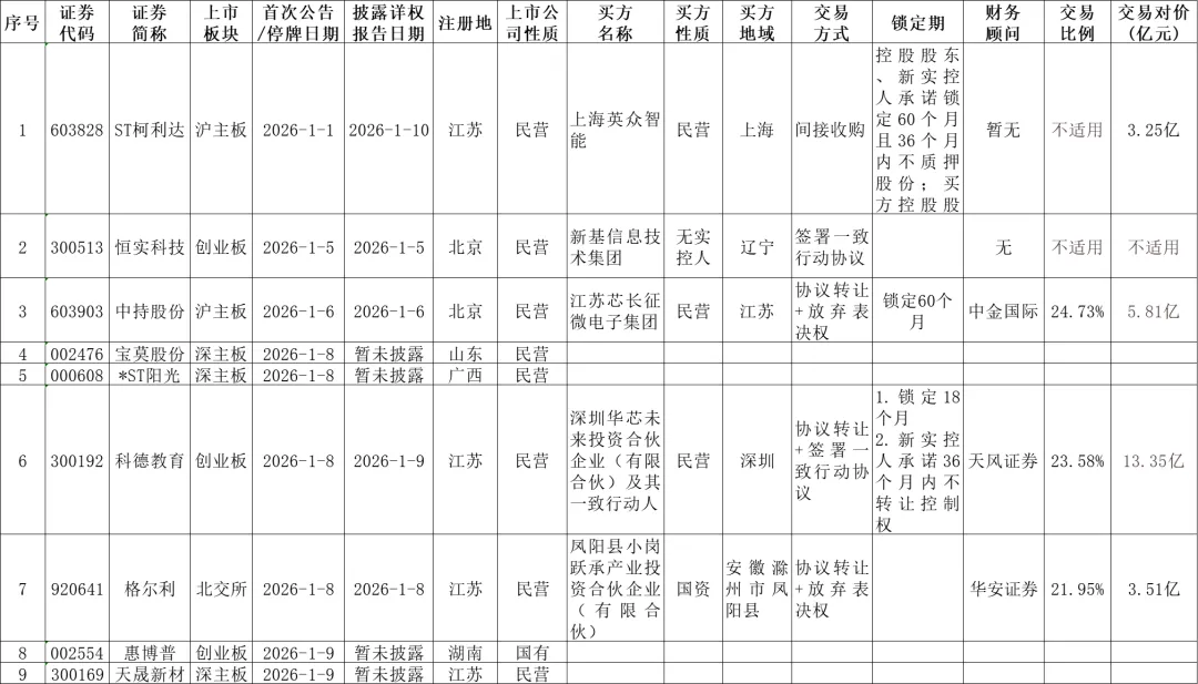 2026年1月1日至11日,沪深北交易所共有9家上市公司首次披露控制权拟发生变化的相关公告,覆盖沪主板、深主板、创业板、北交所,以主板(沪/深)和创业板为主。