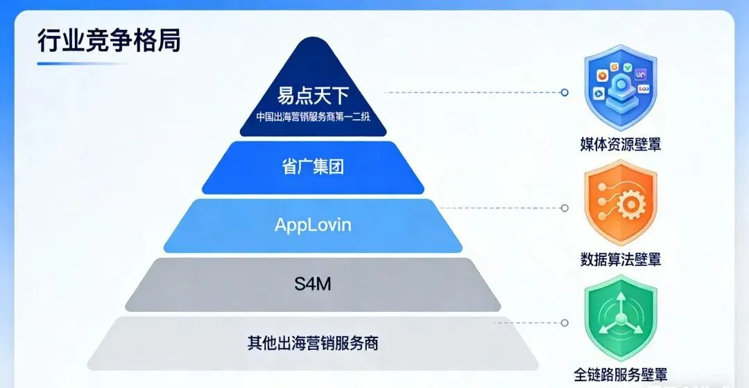 在行业竞争中,易点天下以其媒体资源深度绑定、数据与算法优势以及全链路服务能力,形成了坚实的竞争壁垒,在全球智能营销市场占据重要份额。随着行业红利的持续释放、技术的不断进步以及全球化布局的深化,易点天下未来增长前景广阔,有望在全球数字广告市场和中国企业出海市场中实现持续增长。