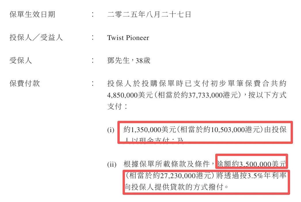保费支付方式还挺灵活,一部分约1050.3万港元(135万美元)是投保人直接付的,剩下的约2723万港元(350万美元)是通过银行贷款,年利率3.5%。