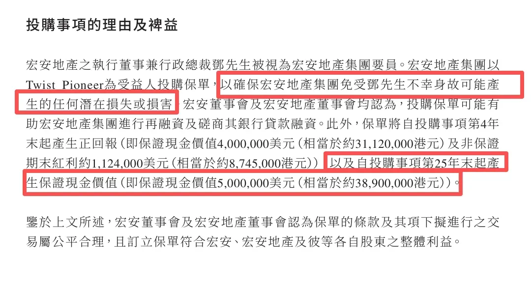 歡朵子昨天刷到条大新闻,上市公司宏安地产(股份代号1243)给自家执行董事兼CEO邓灏康先生,投保了一份香港人寿保单;
