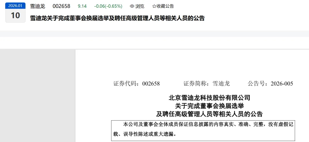 北京雪迪龙科技股份有限公司(以下简称 “公司” 或 “本公司”)于 2026 年 1 月 9 日召开 2026 年第一次临时股东会和公司职工代表大会,选举产生了公司第六届董事会成员。公司第六届董事会由 7 人组成,其中非独立董事 4 名(含由职工代表担任的董事 1 名,由公司职工通过职工代表大会民主选举产生,无需提交股东会审议),独立董事 3 名。公司于同日召开第六届董事会第一次会议,选举产生了公司董事长、第六届董事会各专门委员会委员,并聘任了高级管理人员等相关人员(简历详见附件)。现将有关情况公告如下: