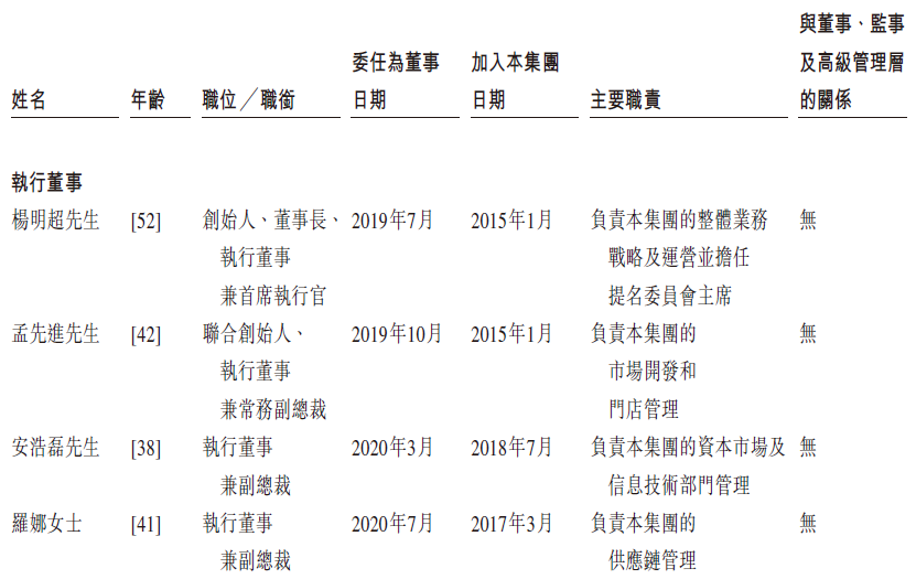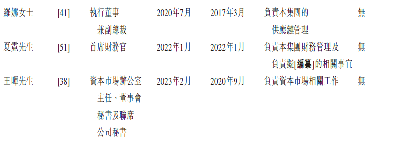 高管包括首席执行官杨明超先生、常务副总裁孟先进先生、副总裁安浩磊先生、副总裁罗娜女士这4名执行董事,以及首席财务官夏霓先生,资本市场办公室主任、董事会秘书及联席公司秘书王晖先生。