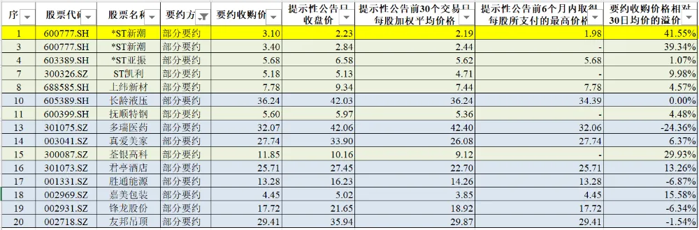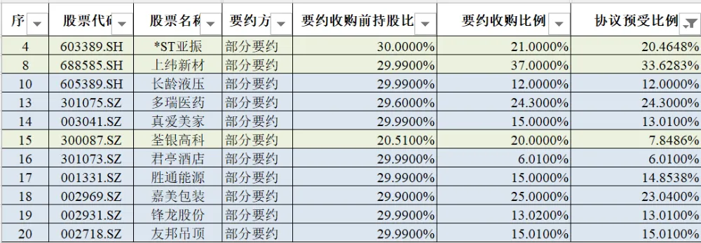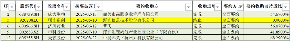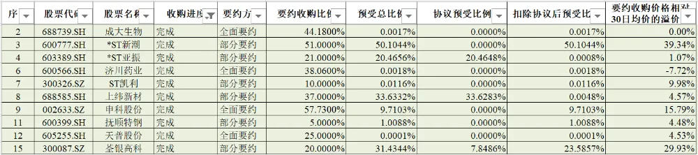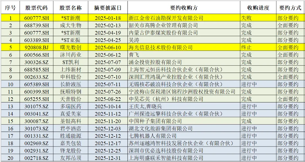自2024年9月“并购六条”落地激活市场后,2025年要约收购数量创下2019年以来近7年新高,更出现了B股反向收购A股、竞争性要约收购(伊泰B股收购*ST新潮)的创新案例,产业整合导向愈发鲜明。按照要约收购报告书摘要披露日统计,2025年度以上市公司作为目标方(被并购方)的要约收购案例共20起,其中,8起正在进行中,10起已完成,2起失败或终止,具体情况如下:(一)全面要约仅占比25%,均属于法定全面要约收购义务情形2025年全面要约案例仅5起、占比25%,均属于由于协议转让或间接收购等导致收购人持有上市公司股份比例超过30%、且不符合豁免要约情形,从而触发法定全面要约收购义务。成大生物:韶关市高腾企业管理有限公司因通过控制辽宁成大(持股15.30%并主导董事会)间接取得成大生物54.67%控制权,触发法定全面要约收购义务。曙光数创:海光信息因筹划换股吸收合并中科曙光(曙光数创控股股东)触发对曙光数创的法定全面要约收购义务,但因海光信息与中科曙光于2025年12月9日宣布终止重组计划,该要约收购事项同步取消。济川药业:因曹飞从父亲曹龙祥处受让济川控股10.10%股权,导致其通过济川控股及西藏济川间接控制济川药业56.07%股份,超过30%的法定要约触发线。申科股份:深圳汇理鸿晟产业控股企业(有限合伙)通过北京产权交易所公开竞价取得申科股份原控股股东何全波及第二大股东北京华创合计41.89%股权,触发法定全面要约收购义务。天普股份:中昊芯英(杭州)科技有限公司及其一致行动人通过“协议转让18.75%股份+向控股股东天普控股增资取得75%股权(间接控制49.54%股份)”组合方式触发全面要约收购义务,发起法定全面要约。(二)部分案例通过“协议转让不超过30%股份+协议预受要约”,规避全面要约收购义务根据《上市公司收购管理办法》第四十七条,收购人拟通过协议方式收购一个上市公司的股份超过30%的,超过30%的部分,应当改以要约方式进行;但符合本办法第六章规定情形的,收购人可以免于发出要约。符合前述规定情形的,收购人可以履行其收购协议;不符合前述规定情形的,在履行其收购协议前,应当发出全面要约。在协议转让比例超过30%时,可以选择“协议转让超过30%+强制全面要约收购”(例如恒大地产要约收购嘉凯城),或者“协议转让不超过30%股份+协议预受要约”,前者的劣势主要体现在如下方面:(1)协议转让股份要等全部要约收购义务履行后,才能办理过户登记;(2)强制全面要约收购的要约收购比例更高,需要收购人准备更多的履约保证金(不少于收购价款总额的20%)存入证券登记结算机构指定的银行;(3)上市公司股价极端下跌情况下,股东可能全部接受要约,从而导致上市公司股权分布不具备上市条件。因此,近年来更多采用“协议转让不超过30%股份+协议预受要约”方案,收购人先协议受让上市公司不超过30%股份,要约收购开始前,收购人与转让方签署预受协议或意向协议,约定转让方同意按照届时发布的要约条件进行要约预受并最终按照要约条件向收购人出售股份。2025年15起部分要约案例中,11起案例存在协议预受要约,除荃银高科案例外,其余案例要约收购比例均接近协议预受比例,反映出收购人仅计划收购协议预受方持有的上市公司股份,无意进一步扩大持股比例。(三)绝大部分案例要约收购价格溢价率不高,收购人通过要约收购巩固控制权的意愿较低要约收购价格的设置需兼顾法定合规底线、收购目的、市场价格与竞争因素等,核心考虑因素归纳如下:这是价格设置的硬性底线,依据《上市公司收购管理办法》第三十五条,要约价格不得低于提示性公告前6个月内收购人取得该股份支付的最高价格(法定最低价),同时低于提示性公告日前30个交易日该种股票的每日加权平均价格的算术平均值的(原则要求),收购人聘请的财务顾问应当就该种股票前6个月的交易情况进行分析,说明是否存在股价被操纵、收购人是否有未披露的一致行动人、收购人前6个月取得公司股份是否存在其他支付安排、要约价格的合理性等。主动要约(多为部分要约):若目的是巩固控制权、确保要约成功,通常会设置溢价价格(一般较市场均价溢价15%-30%),吸引股东预受,甚至与协议转让价格保持一致(如优必选收购锋龙股份、逐越鸿智收购嘉美包装)。法定要约(多为全面要约):若仅为履行控制权变更触发的法定义务,收购人往往并不指望通过要约再额外增持,价格通常贴近法定最低价,无需额外溢价,股东参与度往往较低。若已与特定股东签署预受协议,要约价格通常与协议转让价格一致,确保预受承诺落地;若面向散户股东,需通过溢价提升吸引力;若股东对公司长期价值认可度高,可适当降低溢价幅度。需对标目标公司近期股价走势、行业估值水平(市盈率、市净率)、可比公司并购估值,同时考虑要约期间股价波动预期;若为竞争性要约,价格需高于对手以争夺股份(如伊泰B股收购*ST新潮时,报价高于金帝石油)。需结合目标公司的净资产、盈利能力、成长性、产业协同价值(如技术、渠道、供应链互补)确定价格;若收购后能通过资源整合显著提升公司价值,可承受更高的要约价格。2025年5起全面要约案例的要约收购价格均采用前6个月内收购人取得该股份支付的最高价格,或不高于前30个交易日均价。2025年绝大部分部分要约案例的要约收购价格,相较前30个交易日均价的溢价率低于