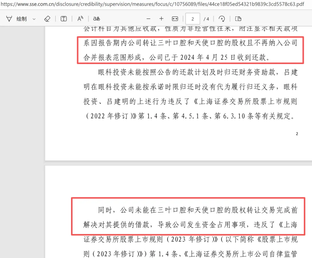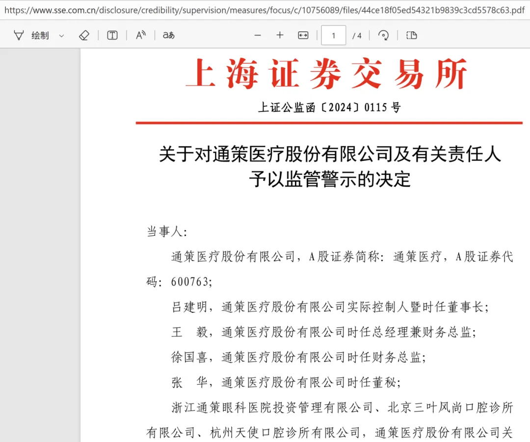 https://www.sse.com.cn/disclosure/credibility/supervision/measures/focus/c/10756089/files/44ce18f05ed54321b9839c3cd5578c63.pdf 上交所关于对通策医疗股份有限公司(通策医疗600763)及有关责任人予以监管警示的决定 公司未能在三叶口腔和天使口腔的股权转让交易完成前解决对其提供的借款,导致公司发生资金占用事项 |