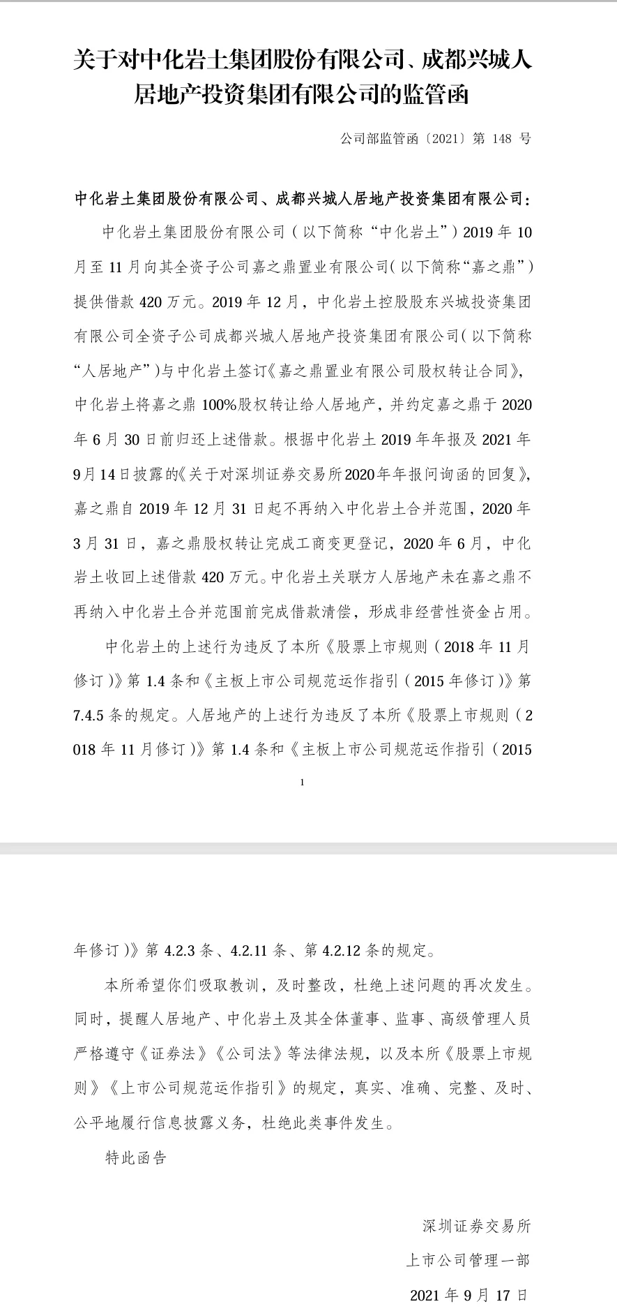 深交所 关于对中化岩土集团股份有限公司(中化岩土 002542)、成都兴城人居地产投资集团有限公司的监管函 公司部监管函〔2021〕第 148 号 中化岩土集团股份有限公司、成都兴城人居地产投资集团有限公司: 中化岩土集团股份有限公司(以下简称“中化岩土”)2019年10月至11 月向其全资子公司嘉之鼎置业有限公司(以下简称“嘉之鼎”)提供借款420万元。2019年12月,中化岩土控股股东兴城投资集团有限公司全资子公司成都兴城人居地产投资集团有限公司(以下简称“人居地产”)与中化岩土签订《嘉之鼎置业有限公司股权转让合同》,中化岩土将嘉之鼎100%股权转让给人居地产,并约定嘉之鼎于2020年6月30日前归还上述借款。根据中化岩土2019年年报及2021年9月14日披露的《 关于对深圳证券交易所2020年年报问询函的回复》,嘉之鼎自2019年12月31日起不再纳入中化岩土合并范围,2020年3 月31日,嘉之鼎股权转让完成工商变更登记,2020年6月,中化岩土收回上述借款420万元。中化岩土关联方人居地产未在嘉之鼎不再纳入中化岩土合并范围前完成借款清偿,形成非经营性资金占用。 中化岩土的上述行为违反了本所《股票上市规则(2018年11月修订)》第 1.4条和《主板上市公司规范运作指引(2015年修订)》第7.4.5 条的规定。人居地产的上述行为违反了本所《股票上市规则(2018 年11 月修订)》第1.4条和《主板上市公司规范运作指引(2015 1 年修订)》第4.2.3条、4.2.11条、第4.2.12条的规定。 本所希望你们吸取教训,及时整改,杜绝上述问题的再次发生。同时,提醒人居地产、中化岩土及其全体董事、监事、高级管理人员严格遵守《证券法》《公司法》等法律法规,以及本所《股票上市规则》《上市公司规范运作指引》的规定,真实、准确、完整、及时、公平地履行信息披露义务,杜绝此类事件发生。 特此函告 深圳证券交易所 上市公司管理一部 2021年9月17日 |