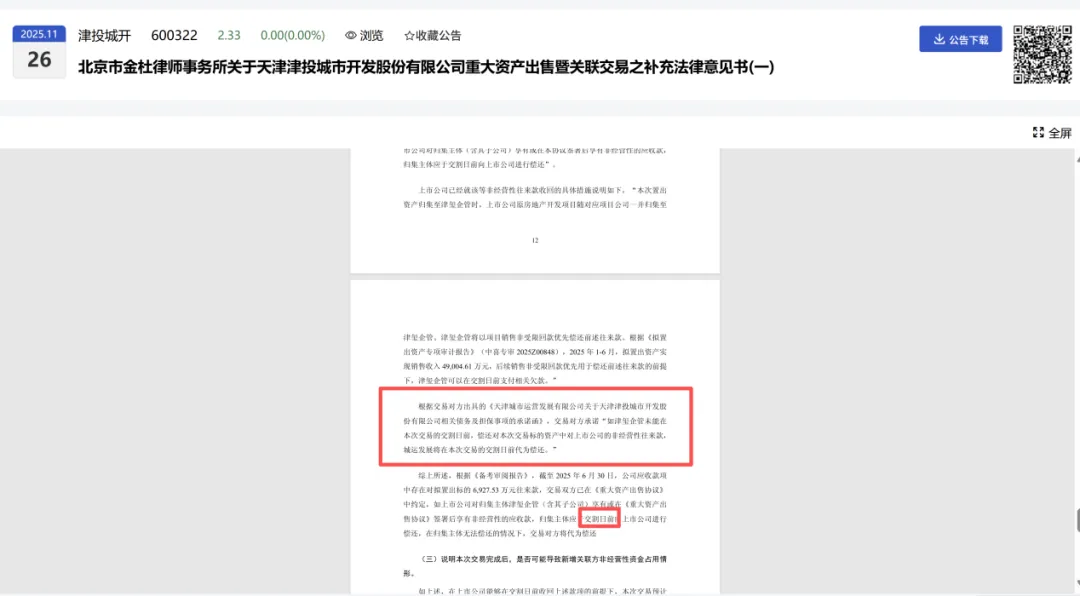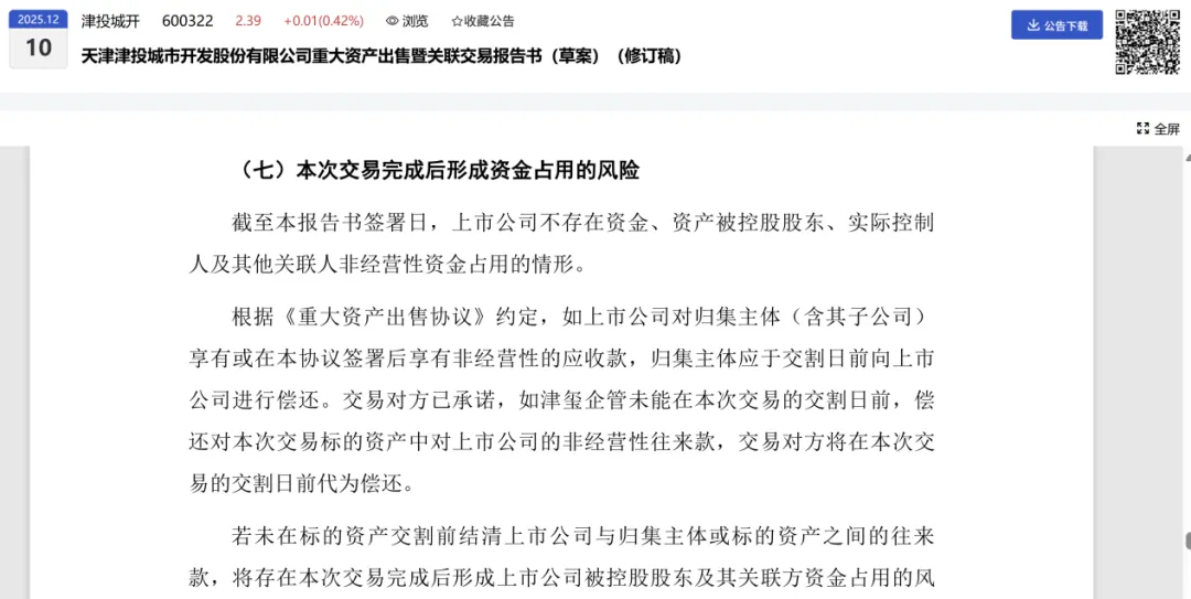 津投城开(600322):根据《重大资产出售协议》约定,如上市公司对归集主体(含其子公司)享有或在本协议签署后享有非经营性的应收款,归集主体应于交割日前向上市公司进行偿还。交易对方已承诺,如津玺企管未能在本次交易的交割日前,偿还对本次交易标的资产中对上市公司的非经营性往来款,交易对方将在本次交易的交割日前代为偿还。 |