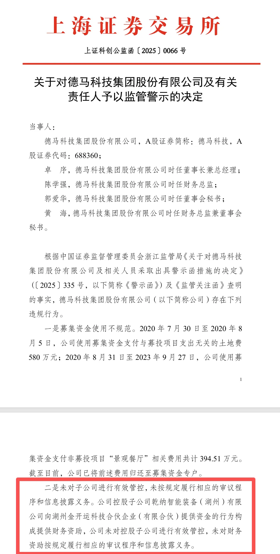 https://www.sse.com.cn/disclosure/credibility/supervision/measures/focus/c/10803838/files/852e048176014644a3e9131ff3e2d3d2.pdf 上交所关于对德马科技集团股份有限公司(德马科技688360)及有关责任人予以监管警示的决定 未对子公司进行有效管控,未按规定履行相应的审议程序和信息披露义务。公司控股子公司乾纳智能装备(湖州)有限公司向湖州金开运科技合伙企业(有限合伙)提供资金的行为构成提供财务资助,公司未对控股子公司进行有效管控,未对财务资助按规定履行相应的审议程序和信息披露义务。 |
