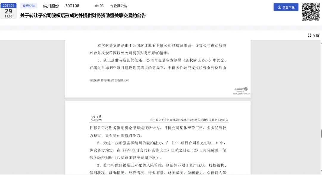 纳川股份(300198)2021.1.29《关于转让子公司股权后形成对外提供财务资助暨关联交易的公告》 富源PPP项目资本金暂定7,990.55万元,根据《股权转让协议》第2.2条约定的股权比例出资,公司应出资3,835.46万元。公司转让富源纳川51%股权完成后,富源纳川计入“其他应付款”科目核算的4,618.63 万元债务性资金,其中2,835.46 万元转为公司投入的项目资本金,剩余 1,783.17 万元被动形成对富源纳川的经营性借款,上述行为将导致公司被动形成对合并报表范围以外公司提供财务资助的情形,其业务实质为公司对原控股子公司日常经营性借款的延续。 公司董事李永年先生和熊永生先生分别在长江环保集团及其一致行动人三峡资本控股有限责任公司(以下简称“三峡资本”)任职,且长江环保集团及其一致行动人三峡资本为公司持股5%以上股份的股东,根据《深圳证券交易所创业板股票上市规则》等法律、法规及规范性文件的相关规定,本次交易构成关联交易。 2021年1月28日,公司第四届董事会第二十一次会议和第四届监事会第十四次会议,审议通过了《关于转让子公司股权后形成对外提供财务资助暨关联交易的议案》,关联董事李永年先生、熊永生先生回避表决。 |