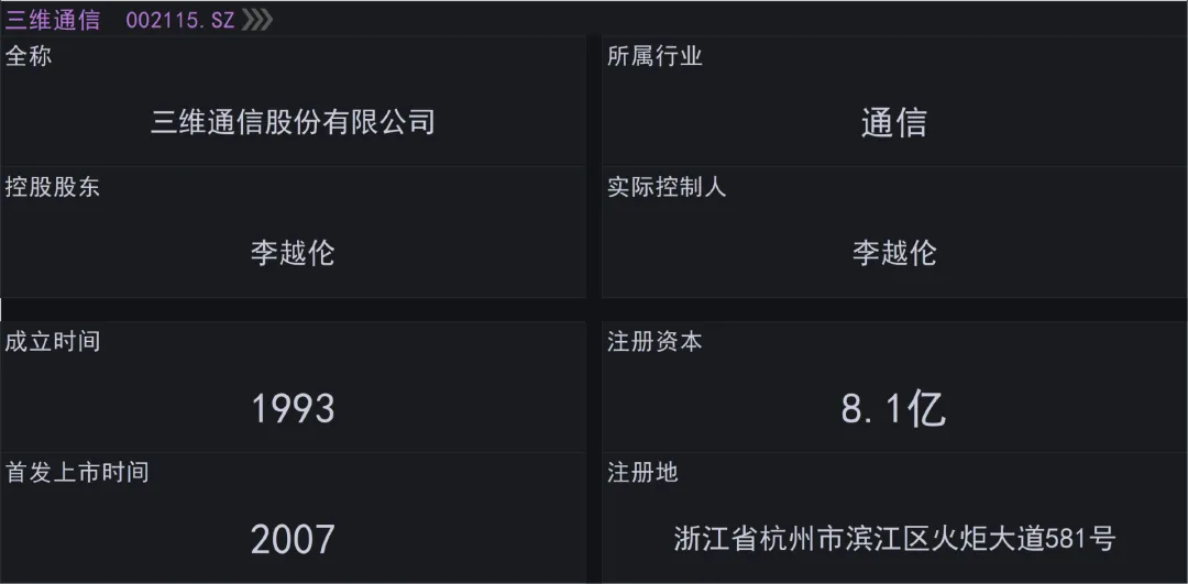三维通信全称叫做三维通信股份有限公司,注册地在浙江省杭州市,股票2007年在深交所上市,公司的控股股东和实际控制人都是李越伦,组织形式属于大型民企,审计机构是天健会计师事务所。