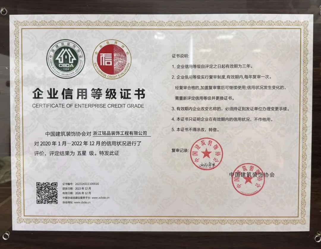 六度荣膺“企业信用五星级评价”之殊荣,意味着铭品装饰在过去的二十余载中,始终如一地坚持高标准运营,工程质量管控、客户服务及诚信经营体系,经历了时间的持续检验与行业的权威认可。这份“六度蝉联”的荣誉,在全国范围内亦属凤毛麟角,它不仅是一系列奖牌与证书,更是铭品装饰深入骨髓的品牌基因与对放心家装理念的坚守。