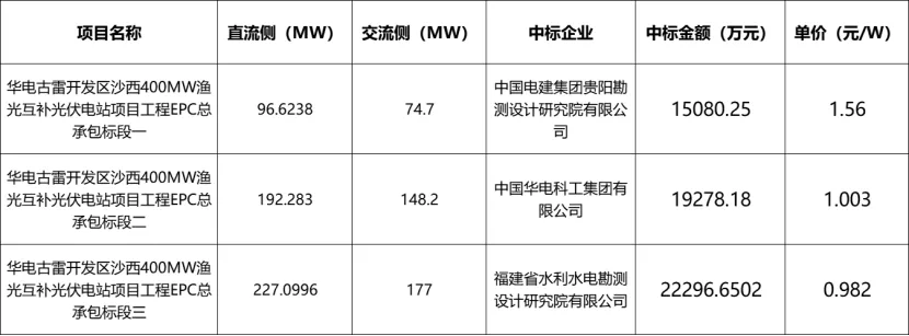 1月7日,华电古雷开发区沙西400MW渔光互补光伏电站项目工程EPC总承包招标项目中标结果公示,本项目分为3个标段,中标企业分别为中国电建集团贵阳勘测设计研究院有限公司、中国华电科工集团有限公司、福建省水利水电勘测设计研究院有限公司。单价区间在0.982-1.56元/W。