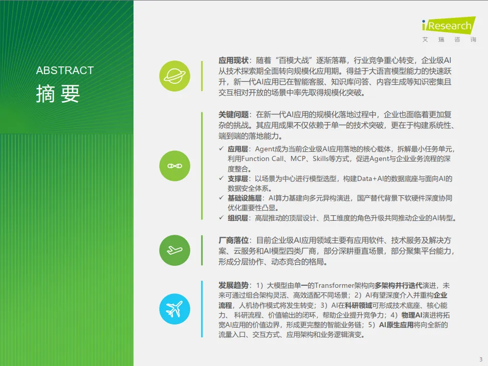 本报告由艾瑞咨询云与AI组研究发布,基于对政策导向、技术路线、市场需求的全面调研,聚焦企业作为采购和使用主体的GenAI驱动型AI应用。报告指出,随着“百模大战”进入后半场,行业竞争重心从模型能力转向应用落地,企业级AI的核心议题变为如何将技术转化为可量化的商业价值。