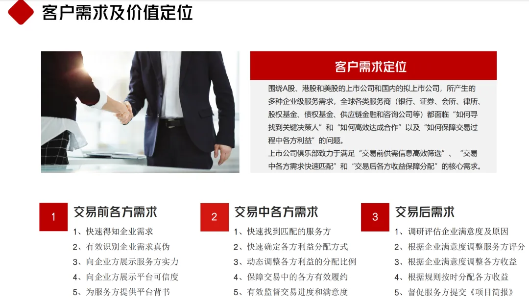 俱乐部的需求战略精准聚焦 A 股、港股、美股上市公司及拟上市公司,与全球服务商(银行、证券、基金、咨询公司等)的交易全周期痛点: