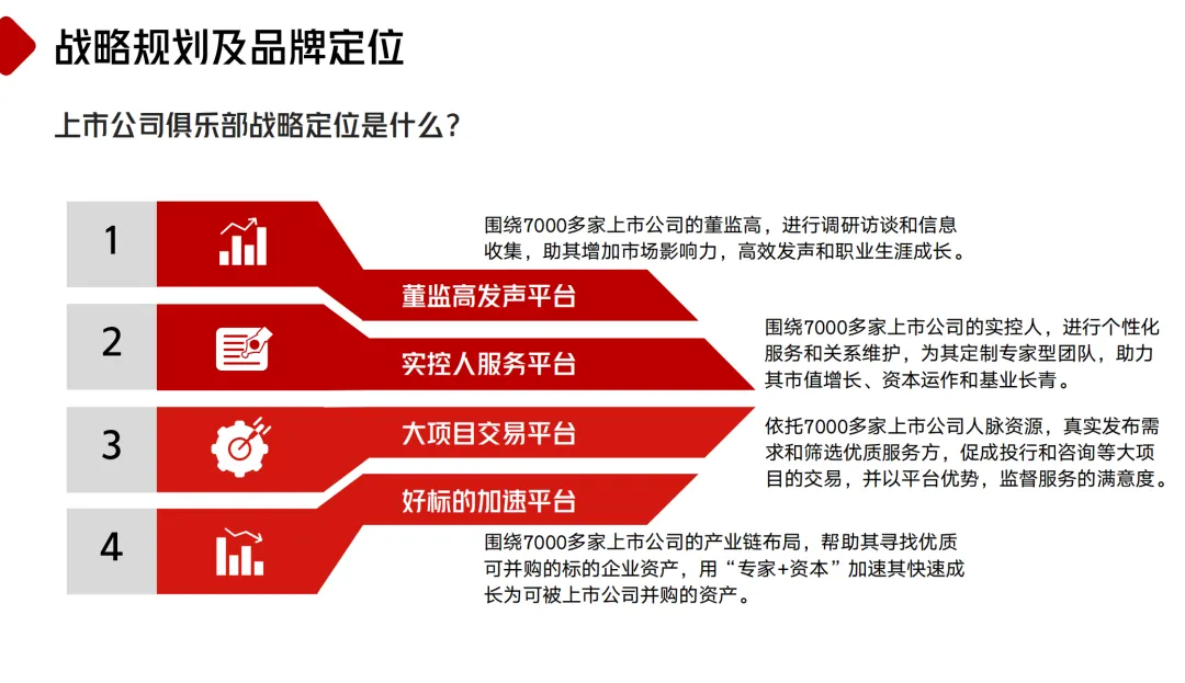 俱乐部以 7000 多家上市公司为核心锚点,确立四大战略定位,形成多维度服务矩阵: