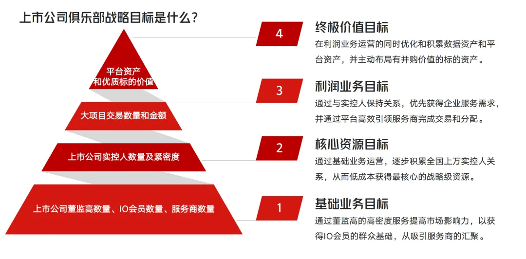 综上,上市公司俱乐部的战略体系以客户需求为出发点,以价值创造为核心,以四大平台为落地载体,以金字塔目标为推进路径,最终致力于成为全球最受人尊敬的上市公司服务协作生态圈,掌握上市公司需求信息的核心话语权,实现社会财富与资源的高效配置。