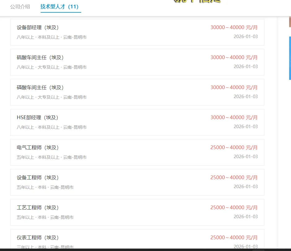 核算会计:薪资 6000~8000 元 / 月,经验要求二年以上,学历要求本科及以上,工作地点云南 - 昆明市 财税专员:薪资 6000~8000 元 / 月,经验要求二年以上,学历要求本科及以上,工作地点云南 - 昆明市 设备部经理(埃及):薪资 30000~40000 元 / 月,经验要求八年以上,学历要求本科及以上,工作地点云南 - 昆明市 硫酸车间主任(埃及):薪资 30000~40000 元 / 月,经验要求八年以上,学历要求大专及以上,工作地点云南 - 昆明市 磷酸车间主任(埃及):薪资 30000~40000 元 / 月,经验要求八年以上,学历要求大专及以上,工作地点云南 - 昆明市 HSE 部经理(埃及):薪资 30000~40000 元 / 月,经验要求八年以上,学历要求本科及以上,工作地点云南 - 昆明市 电气工程师(埃及):薪资 25000~40000 元 / 月,经验要求五年以上,学历要求本科及以上,工作地点云南 - 昆明市 设备工程师(埃及):薪资 25000~40000 元 / 月,经验要求五年以上,学历要求本科,工作地点云南 - 昆明市 工艺工程师(埃及):薪资 25000~40000 元 / 月,经验要求五年以上,学历要求本科,工作地点云南 - 昆明市 仪表工程师(埃及):薪资 25000~40000 元 / 月,经验要求三年以上,学历要求本科,工作地点云南 - 昆明市