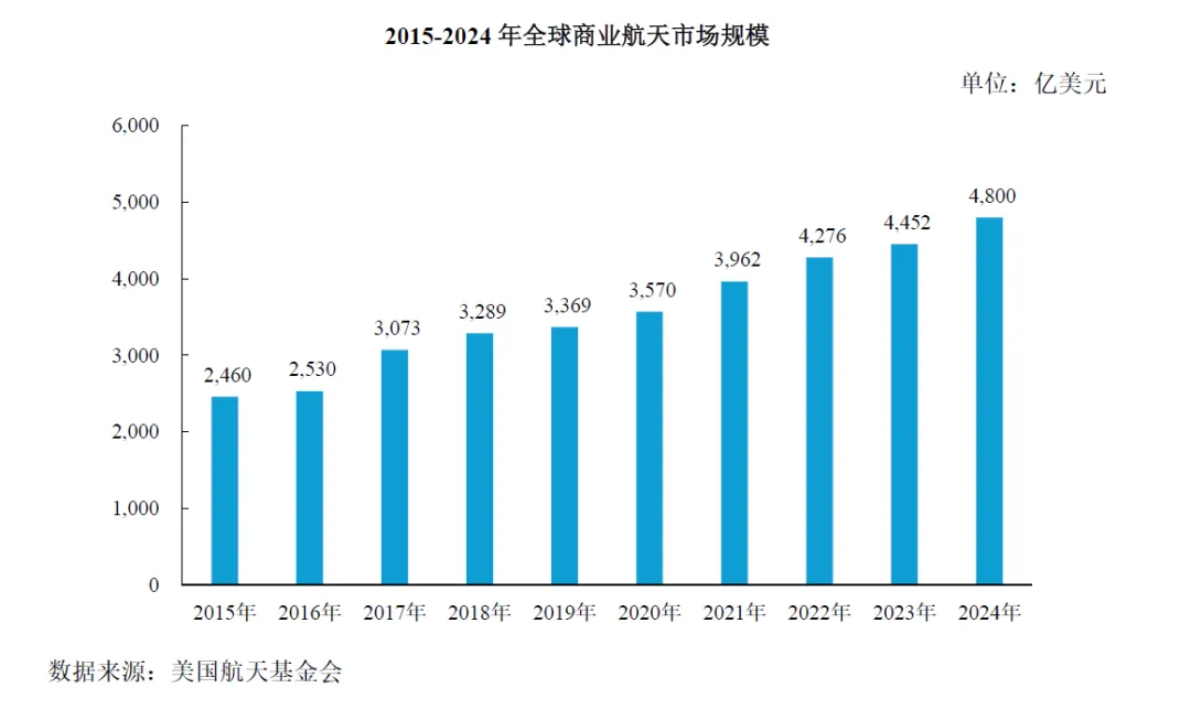 根据第三方行业报告,截至2024 年:全球航天经济规模约 6,120 亿美元,其中商业航天收入约 4,800 亿美元,占比约 78% .在过去十年(2015–2024 年)间,全球商业航天的年均复合增长率约 7.7%。