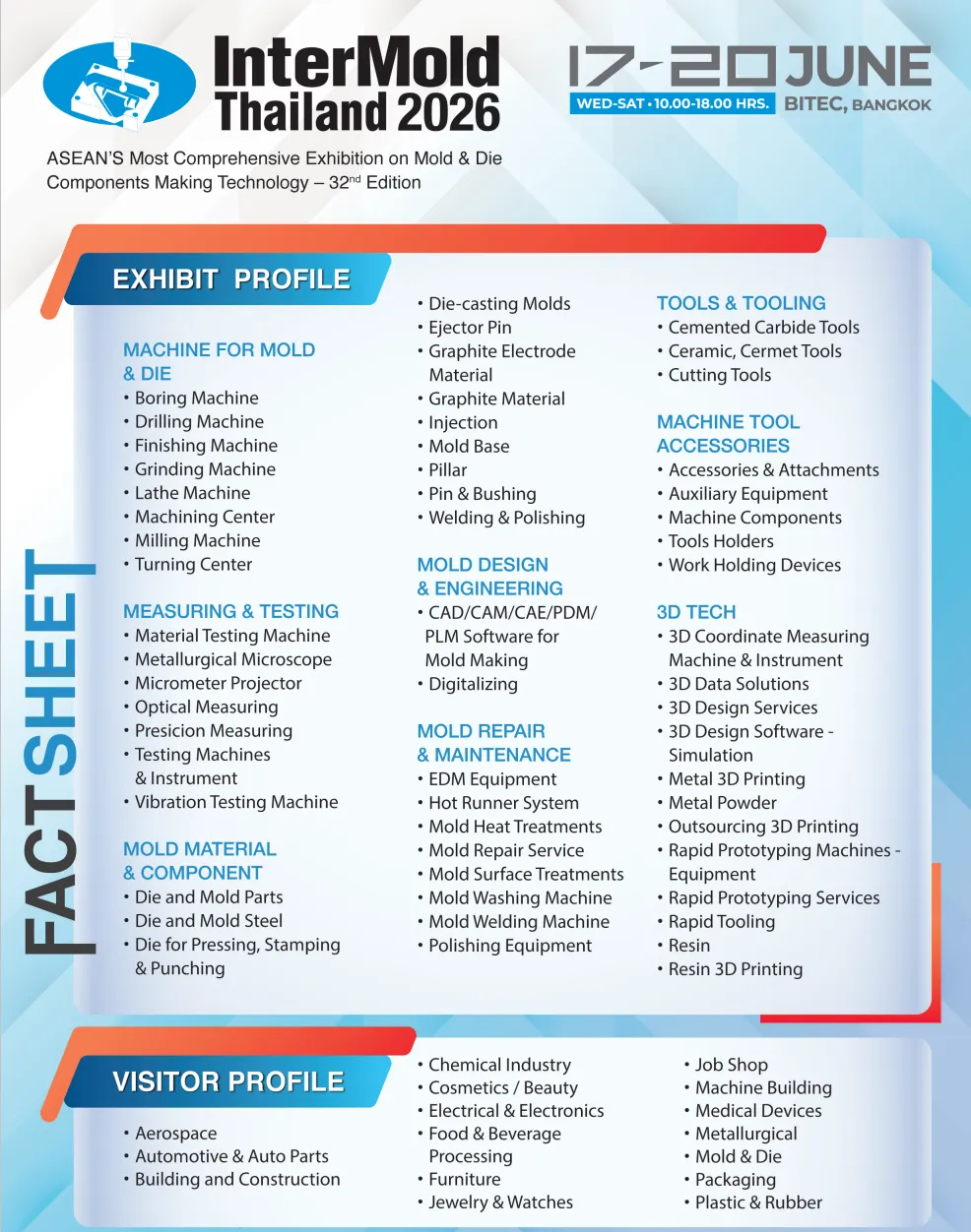 泰国国际模具展览会(INTERMOLD)作为泰国国际机械制造展览会Manufacturing Expo(简称ME)的一个主题,每年一届在泰国曼谷BITEC国际展览中心举办,模具展至今已成功举办了三十一届,占用一个主馆核心位置,专业性强,技术水准具有代表性,是东南亚地区最具最具影响的模具展会。