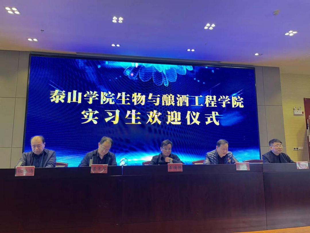 实习欢迎会上,金彩山酒业党委书记孟现军、总经理徐伟和部分高管对泰山学院生物与酿酒工程学院师生的到来表示热烈欢迎。孟宪军介绍了公司的发展、生产经营以及企业文化等情况,高度评价了泰山学院生物与酿酒工程学院的办学经验和办学水平,并对本次实习实训工作进行了部署和动员,指出“纸上学来终觉浅,绝知此事要躬行”,勉励同学们好好把握此次理论联系生产的机会。