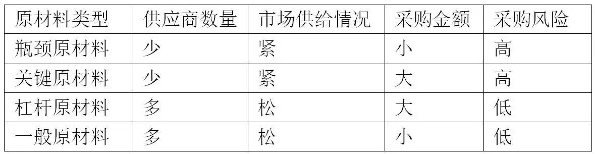 因此,G公司必须对原材料进行分析,明确不同原材料的各自特性,根据这些独有特性进行分类分级,制定不同的采购策略。G公司通过原材料的价值量与供给风险两个维度,可将原材料分为日常原材料、杠杆原材料、瓶颈原材料和关键原材料四种进行综合分析。这四种原材料在供应商数量、市场供给的情况、采购金额、采购风险方面都有不同的特点,如下表所示:
