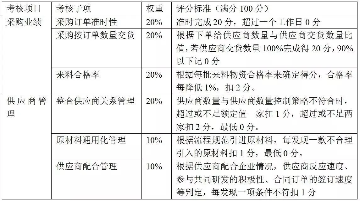 正所谓“有规矩才能成方圆”,G公司应积极地完善采购人员的绩效考核体系,通过完善采购人员的绩效考核体系,对采购人员实行定量考评。这样能避免掺入主观的感情色彩,客观地将被考评者与既定的标准进行比较,也有利于针对不同的采购人员的在工资、晋升上进行差别对待,让采购人员激发学习业务、积极进取的上进心和维护企业利益的责任心,让公司采购队伍能在公平、上进的环境中得到逐步发展。其中采购人员绩效考核应从二个维度出发:采购业绩和供应商管理。下表为采购人员绩效考核的指标。