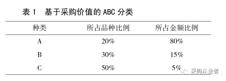 与八二法则有点类似,但更具体。基于采购价值的ABC分类法是从采购价值出发分析许多制造企业的物料采购情况后得出的,如表1所示。