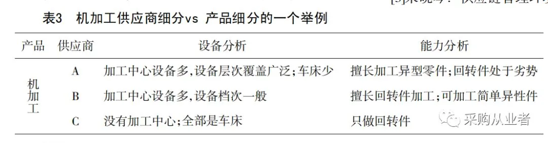 任何一个制造行业,各个企业都有它的特点,拥有独特的设备和制造工艺,在同一种行业内的细分中分别有各自的优势。根据各个产品的特点,将零件在不同的供应商中作优化,也是控制采购成本的一个关键。表3中的分析是对机加工供应商细分vs 产品细分的一个举例。