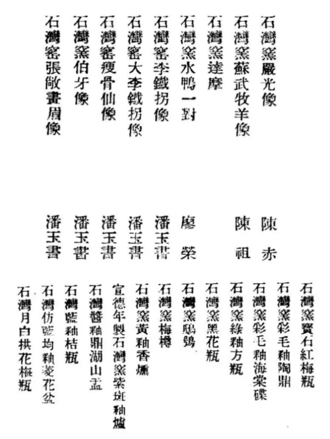 在这些石湾陶塑中,既有瓶、碟、炉、盆等实用器皿,也有最具特色的石湾公仔,如潘玉书的李铁拐、瘦骨仙、伯牙、张敞画眉、行脚僧;廖荣的水鸭;陈赤的严光像;陈祖的苏武牧羊像等作品。