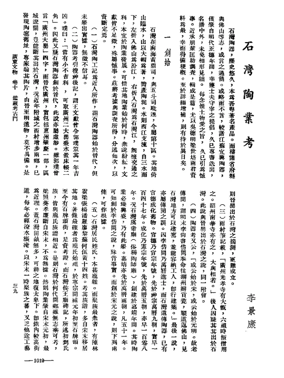 南海籍学者李景康撰写的《石湾陶业考》 / 图源:《广东文物》