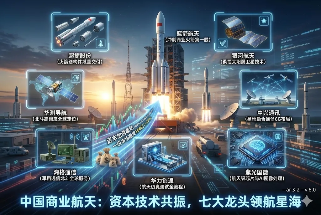 资本层面形成“国家队”、地方国资与市场化资本协同共进的格局。国家制造业转型升级基金向蓝箭航天投资9亿元,创下行业单笔融资纪录。一级市场融资活跃,2025年商业航天领域融资总额达186亿元,同比增长32%。二级市场上,多家企业启动IPO进程,蓝箭航天冲刺“商业火箭第一股”,微纳星空、中科宇航等企业已完成上市辅导备案。产权交易同步活跃,航天科工火箭技术有限公司33亿元股权转让项目挂牌,展现国企改革深化趋势。专注火箭结构件制造,已实现壳段、整流罩等产品批量交付,2025年商业航天业务初步盈利,预计2026年营收将显著增长。突破大规模卷式全柔性太阳翼技术,成功发射全球首款柔性太阳翼卫星,并与泰国运营商达成低轨卫星通信合作,推动技术出海。深耕北斗高精度定位技术,国际业务收入占比超30%,其毫米级、厘米级卫星导航产品广泛应用于全球测量测绘领域。布局星地融合通信,完成多次NTN技术试验,计划提供卫星载荷产品,助力构建6G天地一体化网络。专注军用通信与导航设备,参与国家航天重大工程,其卫星通信技术支撑北斗规模化应用向全球时空信息服务生态延伸。开发卫星导航模拟器、航天仿真测试平台等产品,为商业航天公司提供全流程解决方案,多项技术填补国内空白。航天级芯片供应商,其回读刷新芯片、存储器等产品已导入商业航天产业链,图像AI技术拓展太空数据处理应用场景。常有朋友问我平时都看什么内容充电,今天把这个含金量极高的号分享给大家:如果你已经看腻了模棱两可的“正确的废话”,想在纷杂的信息流中寻找底层逻辑和关键信号,强烈建议关注上面这个号!!!免责声明:本文内容是基于全网公开资料的信息整理,仅可作为学习、交流使用,在任何情况下,本文内容或所表述的意见均不构成对任何人的投资建议,无论是否已经明示或暗示,本文章不能作为道义的、责任的和法律的依据或者凭证。