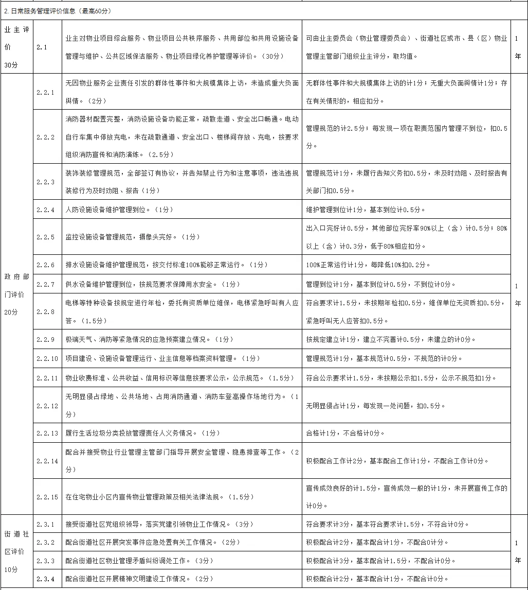 第十一条 日常服务管理评价信息,由物业服务项目所在地县级人民政府物业管理主管部门会同街道办事处(乡镇人民政府),根据省住房和城乡建设厅制定的全省物业服务企业信用信息评价标准和设区的市人民政府物业管理主管部门制定的日常服务管理评价实施办法,于每年第四季度(12月底前完成)开展一次日常服务管理评价和量化评分。设区的市人民政府物业管理主管部门可依规对日常服务管理评价信息进行审核。