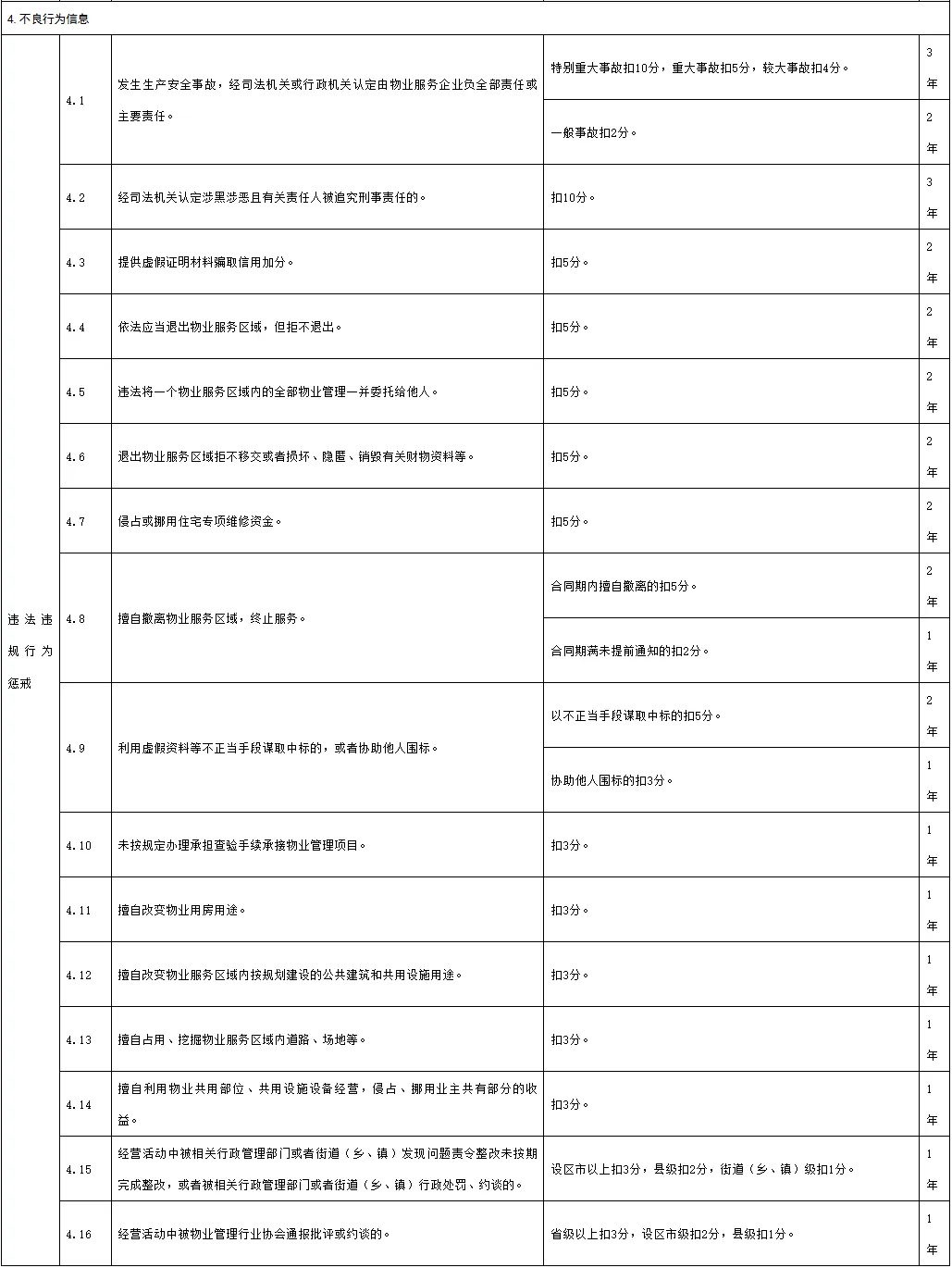 (四)不良行为信息,是指对物业服务企业信用状况判断产生负面影响的信息。主要包括物业服务企业违反法律法规和政策规定以及物业服务合同约定,被行政机关处理(包括行政处罚、责令整改、约谈等)、被司法机关、仲裁机构认定负有责任及其他对其信用状况构成负面影响的信息。
