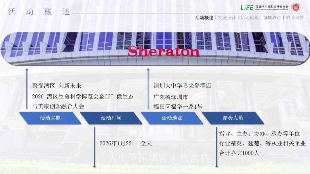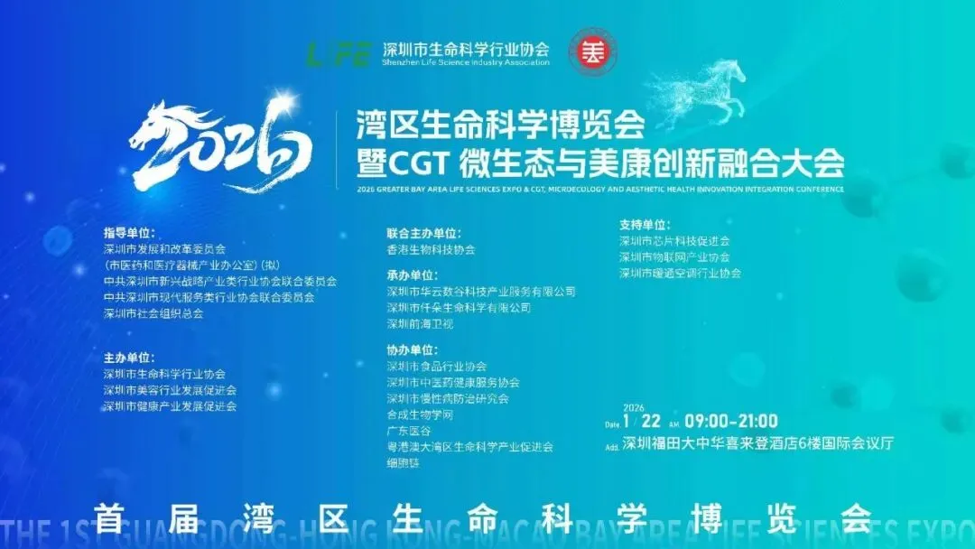 潮起珠江,震响寰宇;鹏城劲风,动晓东方。“十五五”开局启新关键节点,APEC在深圳举办前的首场湾区生命科学行业盛会——由深圳市生命科学行业协会、深圳市美容行业发展促进会、共同主办的2026湾区生命科学博览会暨CGT创新药高质量发展大会,于2026年1月22日在深圳市大中华喜来登国际酒店6楼国际厅举办。大会是承接全球科技资源、面向国内外展示生物科技行业创新成果的重要窗口。大会以“聚变湾区 向新未来”为主题,奏响全球生命科学产业在湾区交融的时代强音。这场跨越区域、直面未来的生命健康与未来生物科技的思想盛宴,立足深圳先行示范区国际化产业势能优势,锚定百年变局下的生命科学产业变革大方向,为中国生物经济高质量发展、新质生产力培育凝聚海内外的力量。